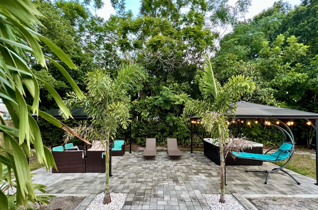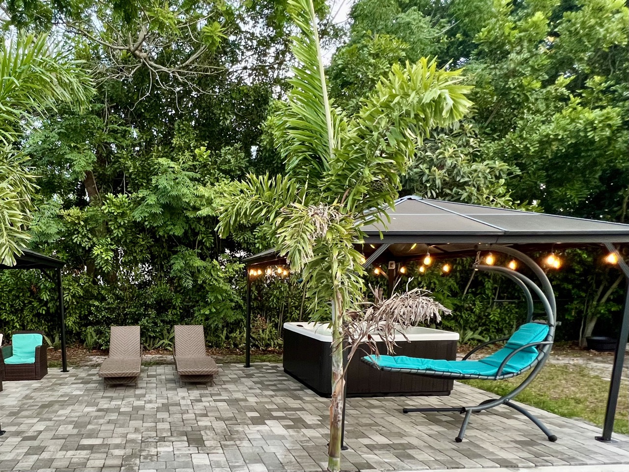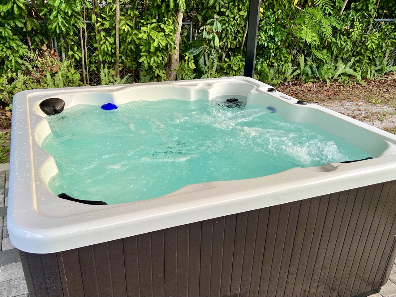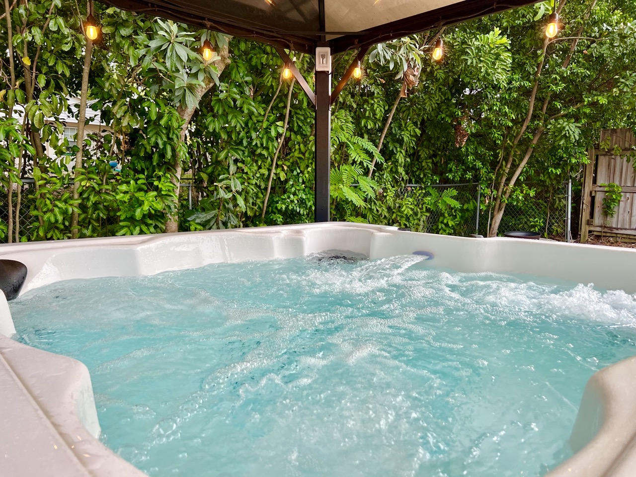 In the intimate backyard, a deluxe jetted hot tub beckons (available by request for an additional charge).