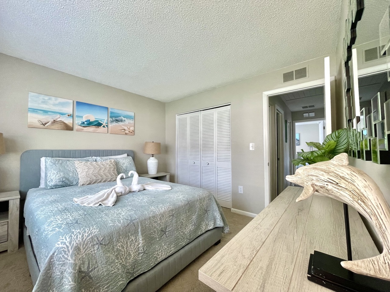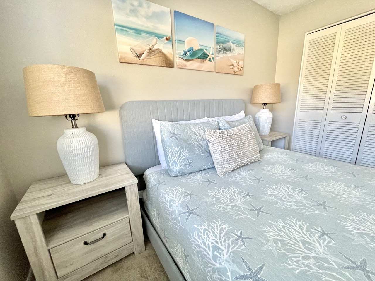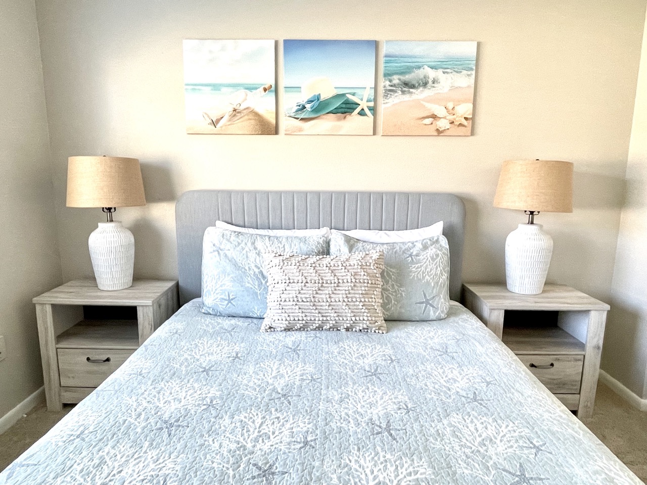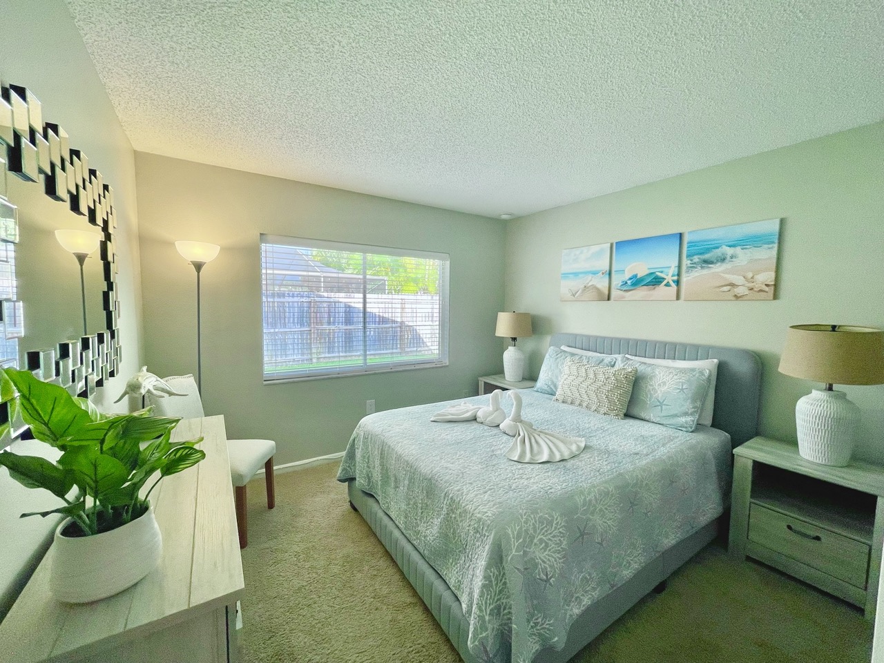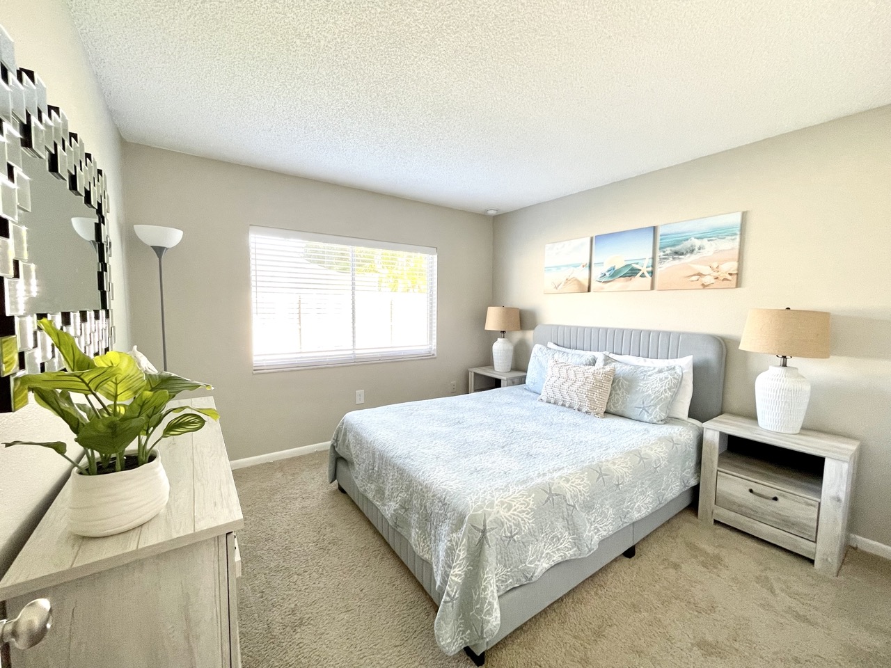 Relax in the primary suite, complete with a walk-in closet and convenient bathroom access to the outdoors. The additional bedrooms, including a delightful kids’ room, are equally inviting with new plush carpeting.