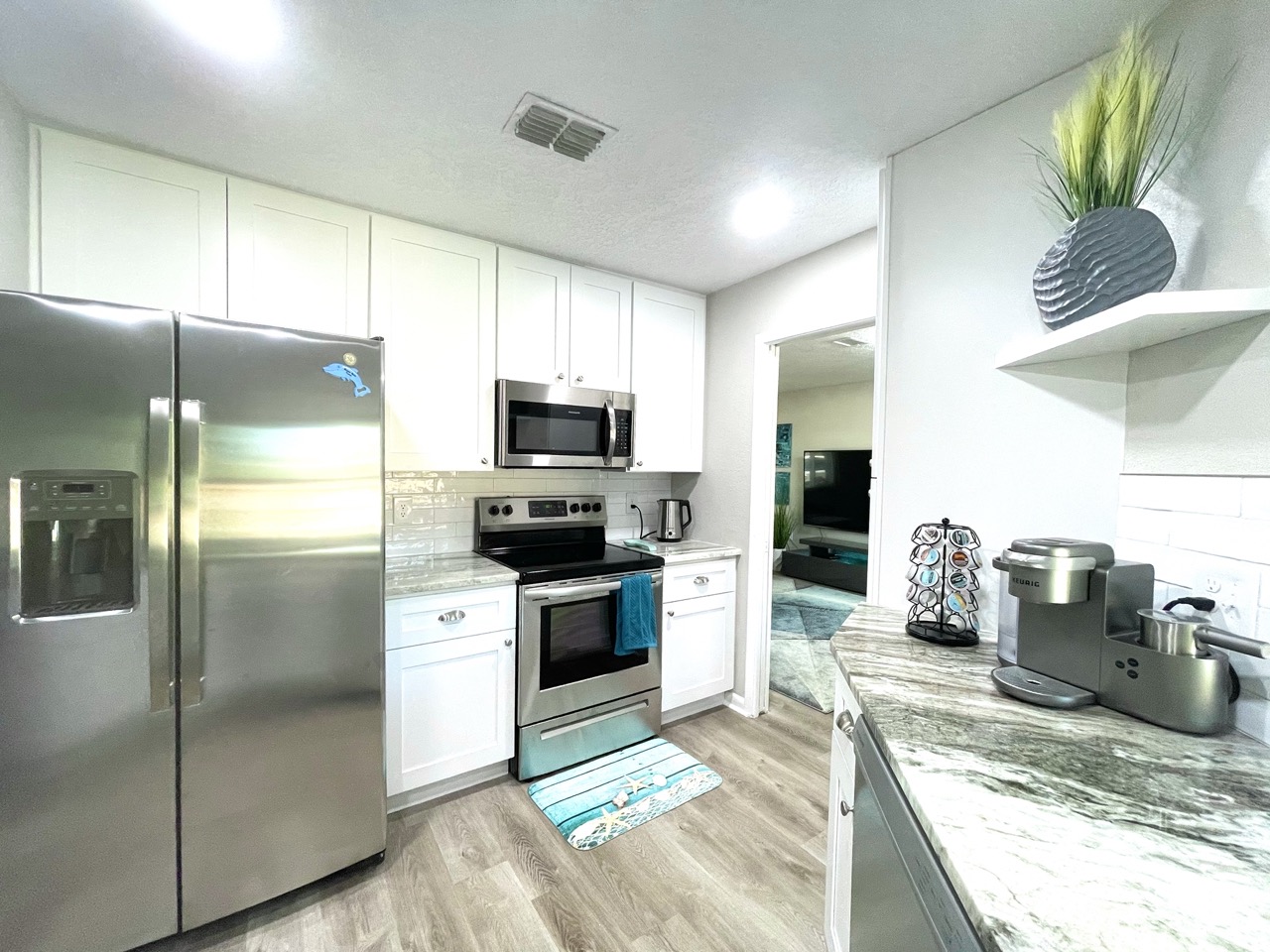 The house offers abundant living space, including two sofa beds . The kitchen is a culinary artist’s dream, featuring top-tier granite countertops, stainless steel appliances, and a breakfast bar. The adjacent dining area, with its sleek sliding glass doors, provides a scenic view of the covered patio, pool, and expansive backyard.
